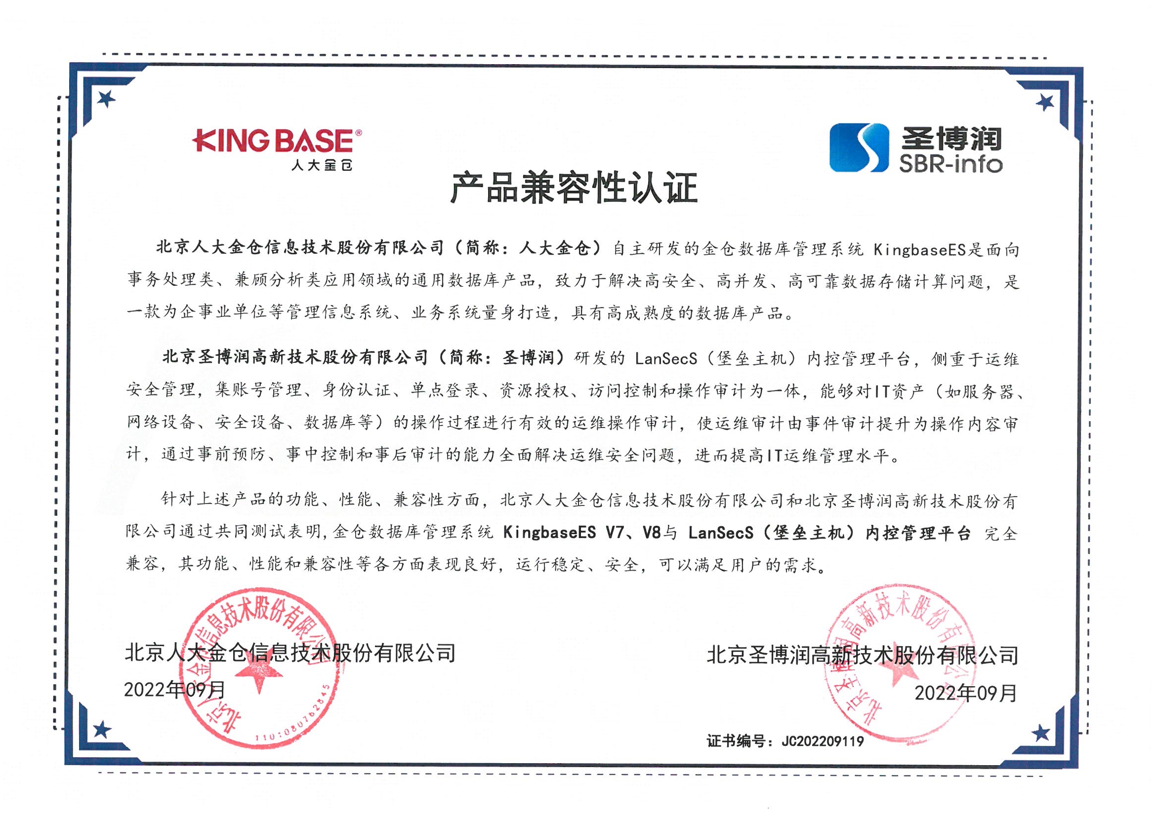 來源:圣博潤近日,北京圣博潤高新技術股份有限公司與北京人大金倉信息技術股份有限公司進行了產品兼容性測試,測試結果表明圣博潤LanSecS(堡壘主機)內控管理平臺、圣博潤特權賬號管理系統與人大金倉KingbaseES V7、V8完全兼容,其功能、性能和兼容性等各方面表現良好、運行穩定、安全,充分滿足用戶需求。人大金倉是國內卓越的數據庫產品與服務提供商,旗下的KingbaseES系列是具備國際先進水平的大型通用數據庫。