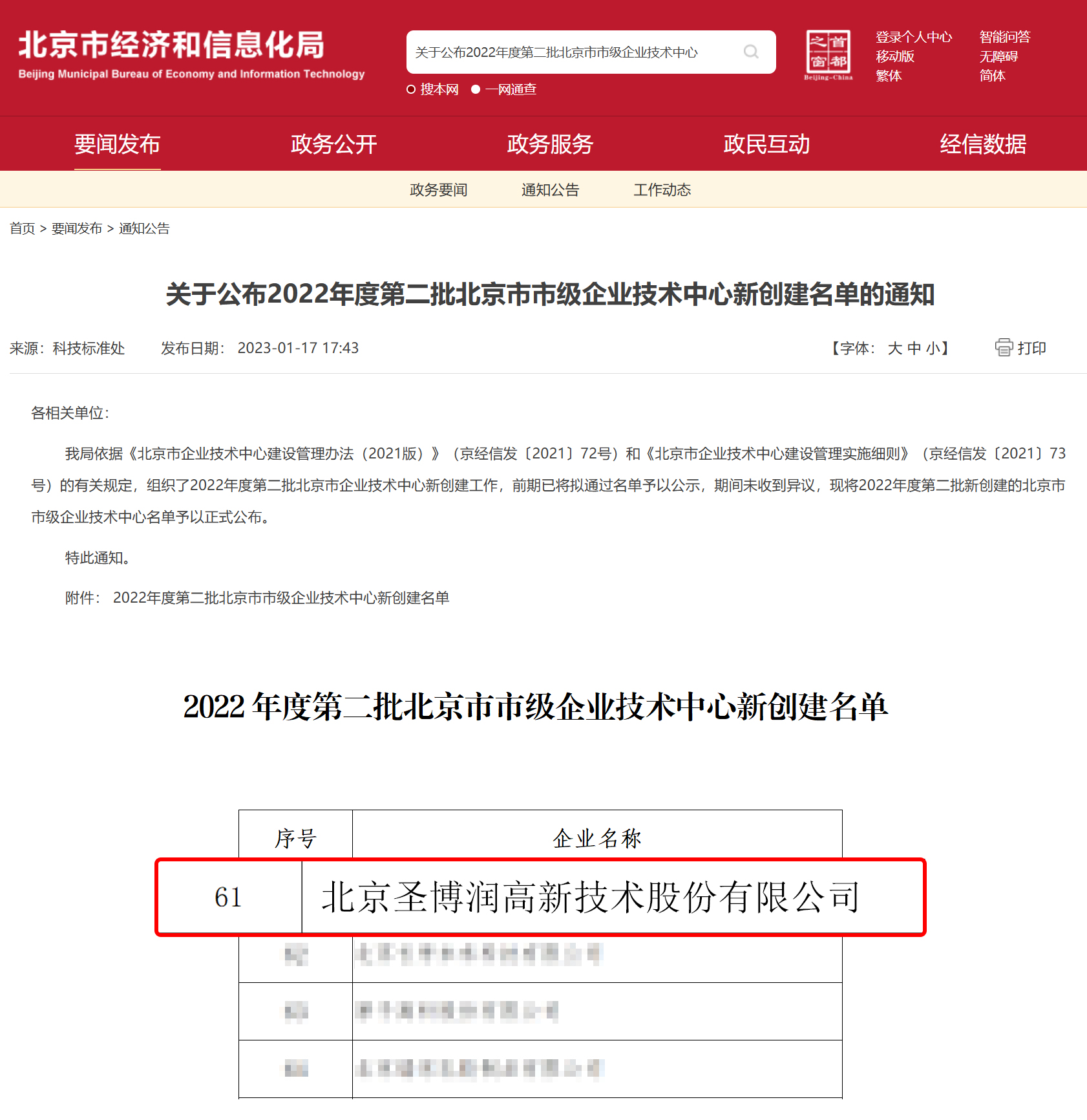 近日,北(bei)(bei)(bei)京市經濟和信息(xi)化局發布的《2022年度第二批北(bei)(bei)(bei)京市市級企(qi)業(ye)技(ji)術中(zhong)心新(xin)(xin)(xin)創建名(ming)單》公(gong)示期滿(man),北(bei)(bei)(bei)京圣博潤(run)高新(xin)(xin)(xin)技(ji)術股(gu)份(fen)有限(xian)公(gong)司正式獲(huo)得“北(bei)(bei)(bei)京市市級企(qi)業(ye)技(ji)術中(zhong)心”認定。這(zhe)是圣博潤(run)近期繼評“北(bei)(bei)(bei)京市專(zhuan)精特新(xin)(xin)(xin)中(zhong)小企(qi)業(ye)”后(hou),又一極具“含金量”的資格認證。