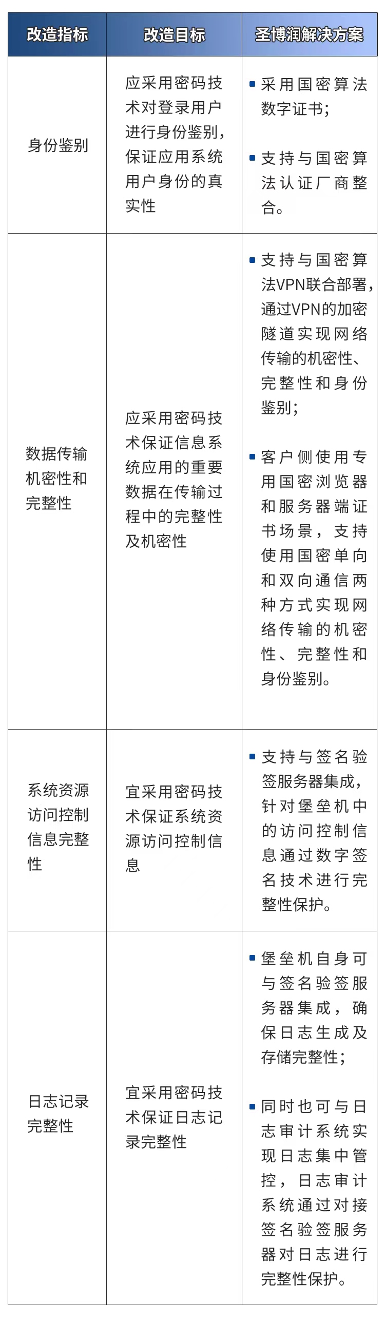 北京圣博潤高新技術股份有限公司作為業內堡壘機頭部廠商,專注運維安全10余年,旗下LanSecS(堡壘主機)內控管理平臺集賬號管理、身份認證、單點登錄、資源授權、訪問控制和操作審計為一體,為用戶提供安全可靠的運維管理與審計解決方案,在合規領域有豐富的經驗并取得了一致好評。在“密評”大背景下,圣博潤堡壘機再次提出了自己的助力方案。