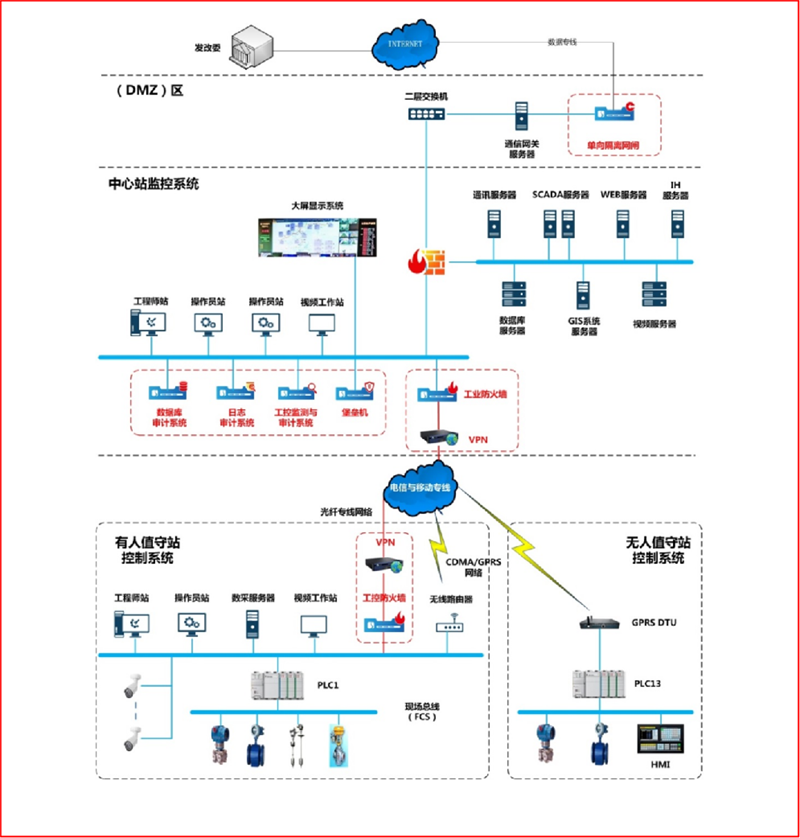市政燃氣自動化系統的結構分為三級:中心站、通信網絡、本地站。每一個本地站的自動化系統就成為信息安全保護的重點,依據《規范》的指導要求,本地站與通信網絡的接口要配置部署工業防火墻作為安全認證的措施。同時,應部署VPN網關保障本地站與中心站數據傳輸的完整性和保密性。