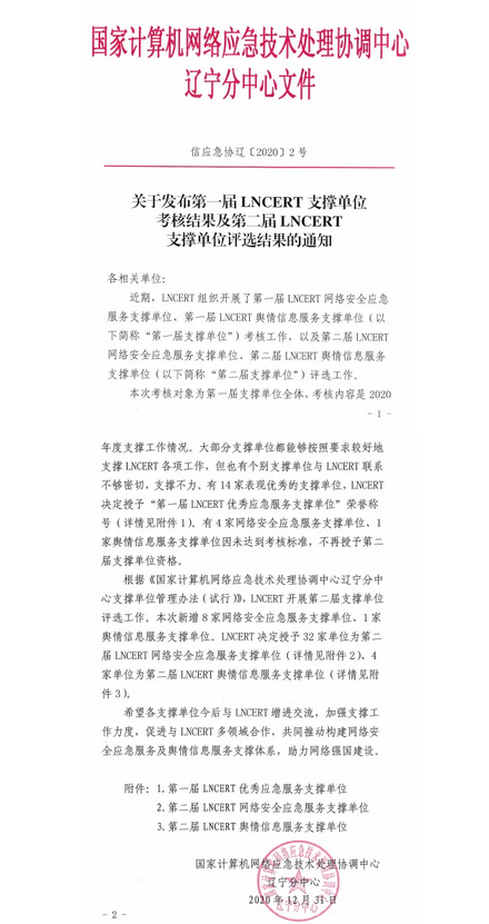 近日,國家計算機網絡應急技術處理協調中心遼寧分中心(LNCERT)公布了第一屆“LNCERT優秀應急服務支撐單位”(以下簡稱優秀支撐單位)考核結果與第二屆“LNCERT支撐單位的評選結果”,圣博潤出色的完成了2020年的支撐工作,被授予“第一屆LNCERT優秀應急服務支撐單位”榮譽稱號。同時,憑借網絡安全應急處置、安全監測與防護方面的過硬實力,成功當選“第二屆LNCERT網絡安全應急服務支撐單位”。
