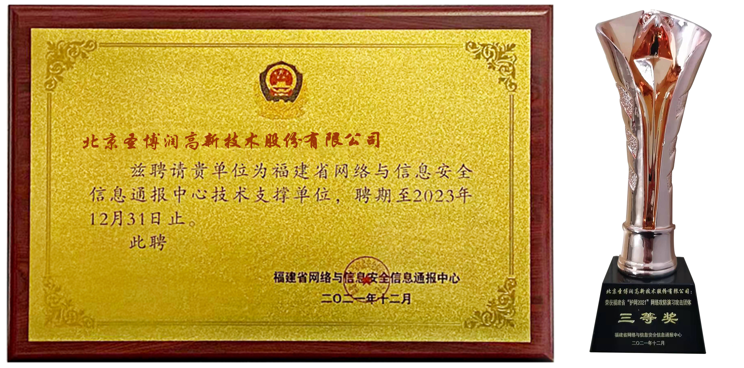 會議對2021年福建省網絡與信息安全信息通報中心工作情況進行了總結,并部署了明年重點工作,同時對年度網絡安全工作先進單位、優秀技術支撐單位、攻防演練獲獎單位等進行了表彰。圣博潤再次受聘為“2022-2023年度福建省網絡與信息安全信息通報中心技術支撐單位,(2017年-2021年連續受聘)”,并榮獲福建省“護網2021”網絡攻防演習攻擊團隊三等獎。