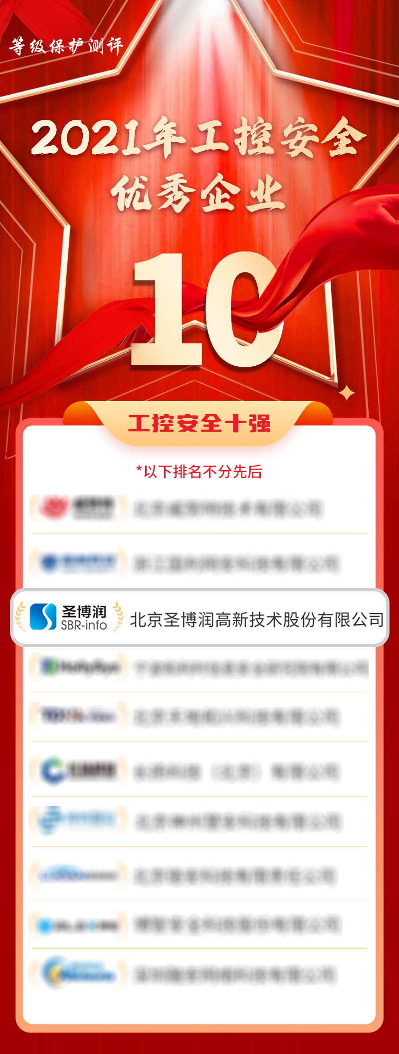 來源:圣博潤2021年網絡安全優秀企業及產品評選活動由等級保護測評主辦,經過專家初評、網安用戶線上投票、專家最終評審三個環節,北京圣博潤高新技術股份有限公司入選“2021年工控安全優秀企業-工控安全十強”。