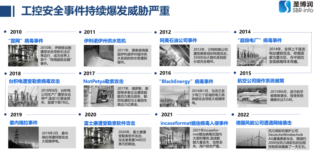 在隨后培訓會上進行的工業互聯網平臺實踐、數字化轉型實踐和工業互聯網信息安全主題分享議程中,北京圣博潤高新技術股份有限公司(以下簡稱圣博潤)售前總監-孫成,以多年行業實踐經驗為依據,從工業互聯網行業現狀、工業互聯網發展趨勢、國家政策法規、?安全產品及解決方案等方面,開展以“工業互聯網安全防護體系建設”為主題的培訓演講。孫成從2010年“震網”病毒事件引出近年來國內外發生的大規模工業互聯網安全事件及造成的嚴重后果。通過對近年安全事件的梳理和剖析,發現工業互聯網系統遭受攻擊多數集中在關鍵基礎設施領域,并逐漸波及到全行業,由此可見,當前工業互聯網安全狀況不容樂觀。