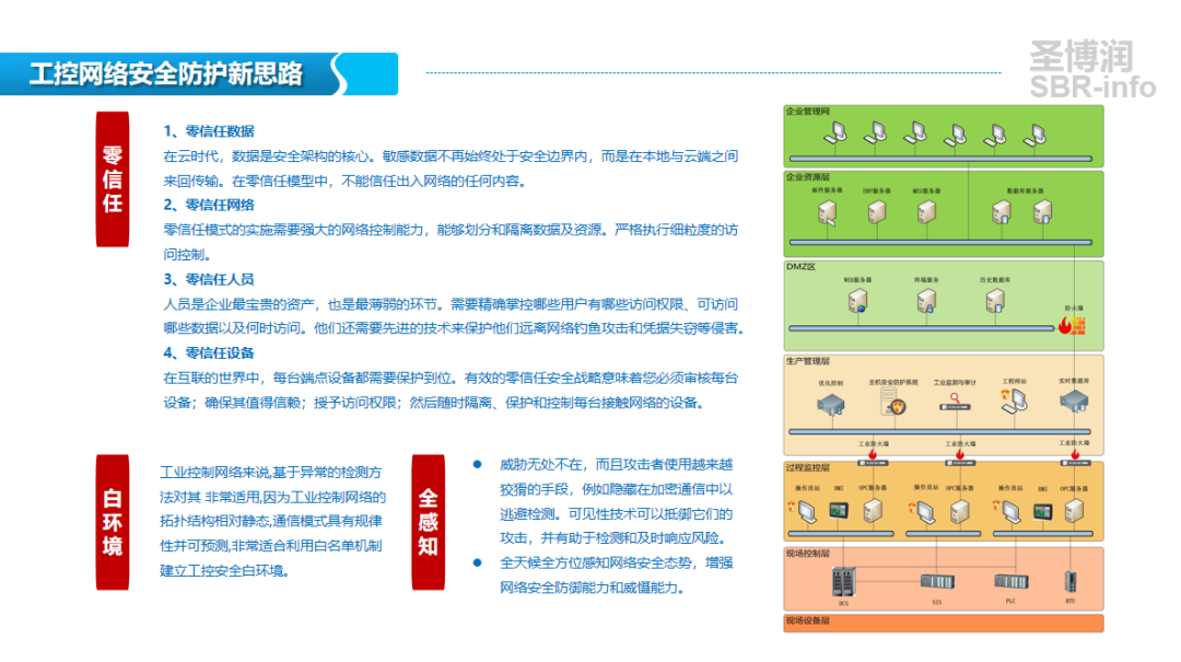 隨著《關鍵信息基礎設施安全保護條例》的正式實施,劉雄認為工控安全需要發展新目標、新思路來滿足關保要求,隨后分享了圣博潤針對工業互聯網企業網絡安全分類分級制定的安全防護解決方案