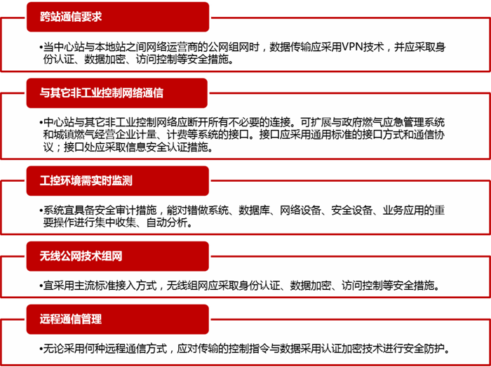 《規范》說明了市政燃氣自動化系統建設的安全性是指核心數據和報警數據要完整和可靠,具備嚴格的用戶權限功能,防病毒及黑客攻擊、保證燃氣系統的安全操作運行。規定市政燃氣自動化系統建設和運行維護應具備安全防護和應急措施,可根據需要配置網絡防火墻、網閘等安全網關類設備、入侵檢測類設備等。