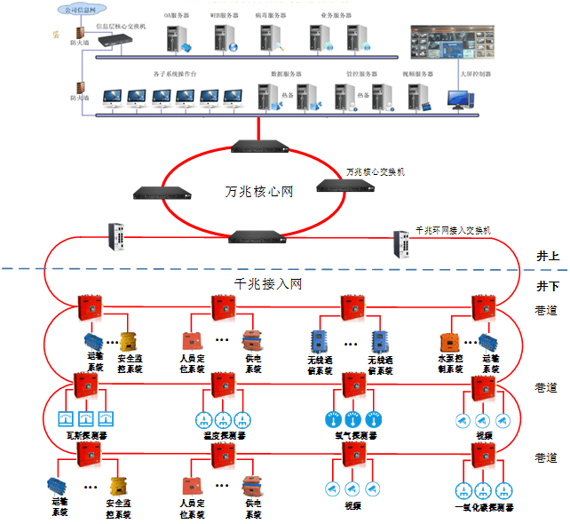 礦井工業以太環網系統就是將礦井環境監控子系統、各生產環節自動控制子系統通過高速工業以太環網和自動化平臺軟件整合,通過防火墻與礦級管理系統相連,來實現全礦井的管控一體化。